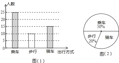 分析 (1)从两图中可以看出乘车的有25人,占了50%,所以共有学生50人;总人数减乘车的和骑车的就是步行的,根据数据画直方图就可;要求扇形的度数就要先求出骑车的占的百分比,然后再求度数;