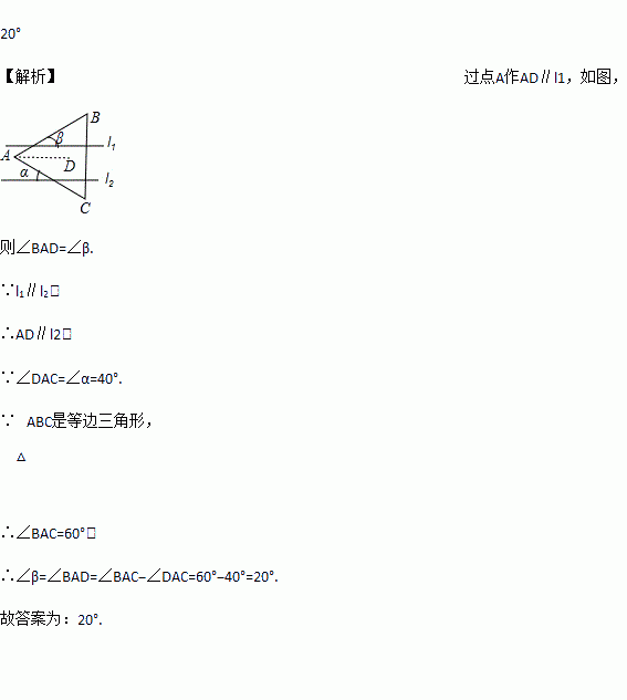 如图,已知直线l1∥l2,将等边三角形如图放置,若∠α=40°,则∠β等于______.