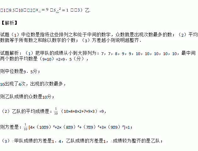 某校初三一班组织了一次经典诵读比赛,甲、乙两队各10人的比赛成绩如下表(10分制):