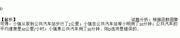 某星期下午,小强和同学小明相约在某公共汽车站一起乘车回学校,小强从家出发步行到车站,等小明到了后两人一起乘公共汽车回到学校.图中表示小强离开家的路程y(公里)和所用的时间x(分)之间的函数关系.下列说法错误的是( )