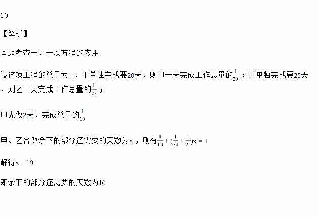 一项工程,甲单独完成需要20天,乙单独完成需要25天,由甲先做2天,然后甲、乙一起做,余下的部分还要做________天才能完成.