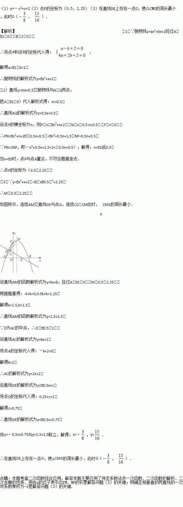 已知抛物线y=ax2+bx+2经过A(﹣1,0),B(2,0),C三点.直线y=mx+0.5交抛物线于A,Q两点,点P是抛物线上直线AQ上方的一个动点,作PF⊥x轴,垂足为F,交AQ于点N.
