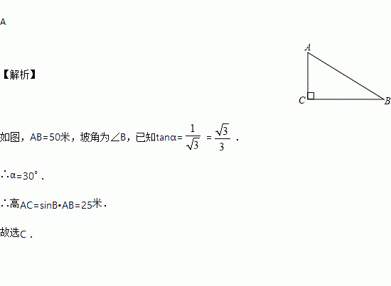 某人沿坡度i=1: 的坡面向上走50米,则此人离地面的高度为( )