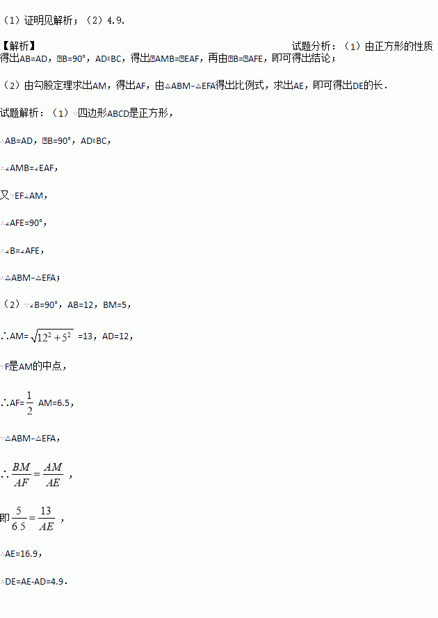 如图,正方形ABCD中,M为BC上一点,F是AM的中点,EF⊥AM,垂足为F,交AD的延长线于点E,交DC于点N.