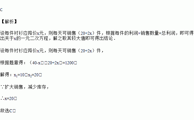 某商场销售一批名牌衬衫,平均每天可售出20件,每件盈利40元,为扩大销售,尽快减少库存,商场决定釆取降价措施,调查发现,每件衬衫,每降价1元,平均每天可多销售2件,若商场每天要盈利1200元,每件衬衫应降价( )