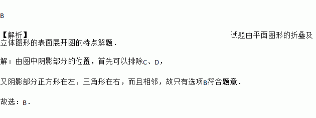 图①是由白色纸板拼成的立体图形,将它的两个面的外表面涂上颜色,如图②所示.则下列图形中,是图②的表面展开图的是( ).