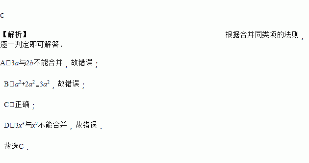A. 3a+2b=5ab B. a2+2a2=3a4 C. 5y3-3y3=2y3 D. 3x3-x2=2x