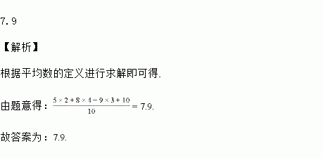 李明同学进行射击练习,两发子弹各打中5环,四发子弹各打中8环,三发子弹各打中9环.一发子弹打中10环,则他射击的平均成绩是________环.