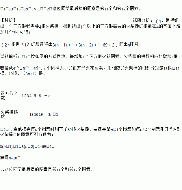 (2)某同学用若干根火柴棒按上图呈现的规律摆图案,摆完了第1个,第2个,…,第n个图案后剩下了69根火柴棒,若要摆完第n+1个和第n+2个图案刚好差2根火柴棒.问最后能摆成的图案是哪二个图案?