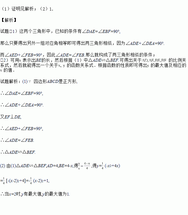 (2)设正方形的边长为4,AE=x,BF=y.当x取什么值时,y有最大值?并求出这个最大值.