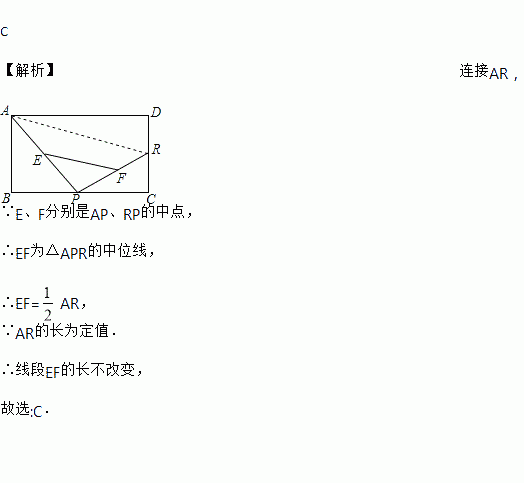 C 【解析】连接AR, ∵E、F分别是AP、RP的中点, ∴EF为△APR的中位线, ∴EF=AR, ∵AR的长为定值. ∴线段EF的长不改变, 故选:C.