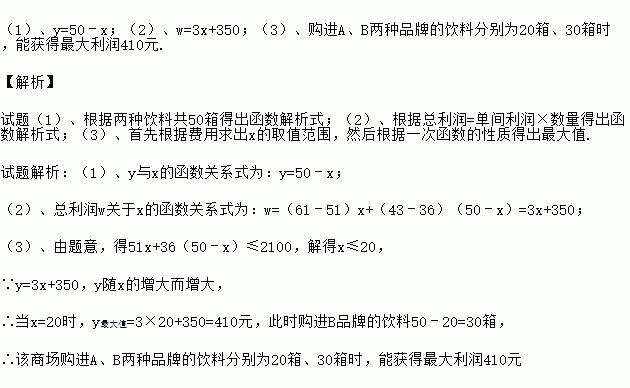 (3)如果购进两种饮料的总费用不超过2100元,那么该商场如何进货才能获利最多?并求出最大利润.