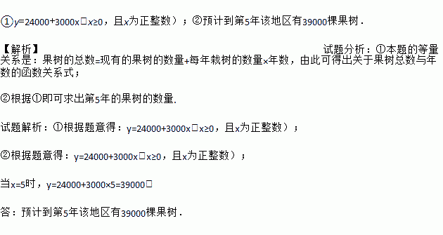 ①y=24000+3000x(x≥0,且x为正整数);②预计到第5年该地区有39000棵果树. 【解析】试题分析:①本题的等量关系是:果树的总数=现有的果树的数量+每年栽树的数量×年数,由此可得出关于果树总数与年数的函数关系式; ②根据①即可求出第5年的果树的数量. 试题解析:①根据题意得:y=24000+3000x(x≥0,且x为正整数); ②根据题意得:y=24000+...