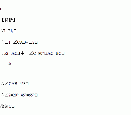 如图,两条直线l1∥l2,Rt△ACB中,∠C=90°,AC=BC,顶点A、B分别在l1和l2上,∠1=20°,则∠2的度数是( )