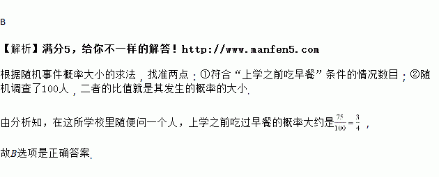 在一所有名学生的学校随机调查了人,其中有人上学前吃早餐,在这所学校里随便问一个人,上学之前吃过早餐的概率是( )