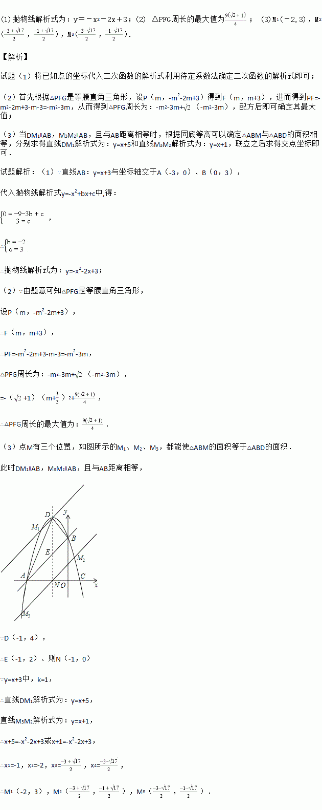 (3)在抛物线y=-x2+bx+c上是否存在除点D以外的点M,使得△ABM与△ABD的面积相等?若存在,请求出此时点M的坐标;若不存在,请说明理由.