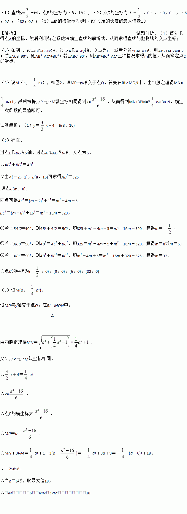 (3)过线段AB上一点P,作PM∥x轴,交抛物线于点M,点M在第一象限,点N(0,1),当点M的横坐标为何值时,MN+3MP的长度最大?最大值是多少?