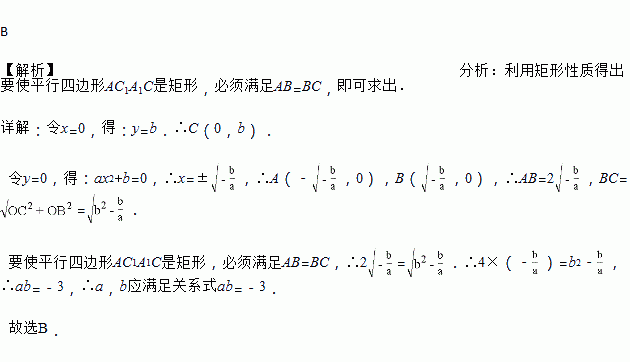 如图,抛物线m:y=ax2+b(a<0,b>0)与x轴于点A、B(点A在点B的左侧),与y轴交于点C.将抛物线m绕点B旋转180°,得到新的抛物线n,它的顶点为C1,与x轴的另一个交点为A1.若四边形AC1A1C为矩形,则a,b应满足的关系式为( )
