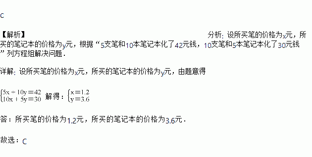 懒羊羊:哦,我忘了,只记得先后买了两次,第一次买了5支笔和10本笔记本共花了42元钱,第二次买了10支笔和5本笔记本共花了30元钱。