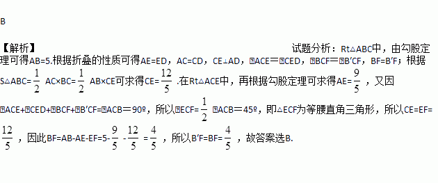 如图,Rt△ABC中,∠ACB=90°,AC=3,BC=4.将边AC沿CE翻折,使点A落在AB上的点D处;再将边BC沿CF翻折,使点B落在CD的延长线上的点B′处,两条折痕与斜边AB分别交于点E、F,则线段B′F的长为( )