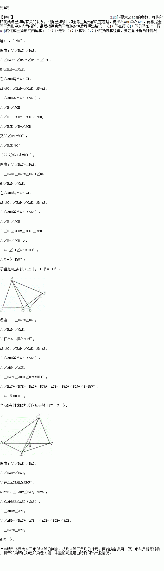ÔÚ¡÷ABCÖУ¬AB=AC£¬µãDÊÇÖ±ÏßBCÉÏÒ»µã£¨²»ÓëB¡¢CÖØºÏ£©£¬ÒÔADΪһ±ßÔÚADµÄÓÒ²à×÷¡÷ADE£¬Ê¹AD=AE£¬¡ÏDAE=¡ÏBAC£¬Á¬½ÓCE£®