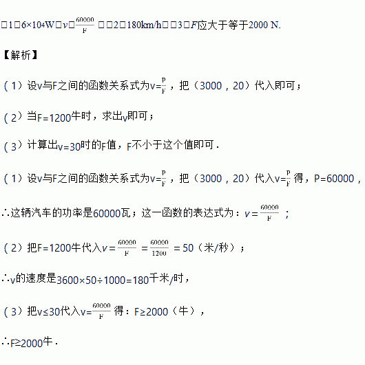 某汽车的功率P为一定值,汽车行驶时的速度v(m/s)与它所受的牵引力F(N)之间的函数关系式如图所示.