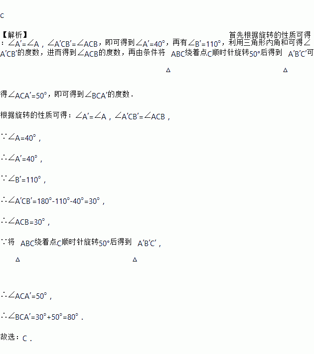 如图,将△ABC绕着点C顺时针旋转50°后得到△A’B’C.若=40°,=110°,则∠的度数为( )