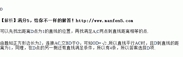 如图,正方形的对角线长为,若直线满足:点到直线的距离为,、两点到直线的距离相等,则符合题意的直线的条数为( )