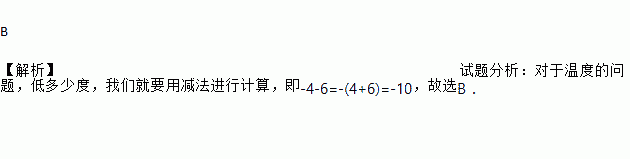 B 【解析】试题分析:对于温度的问题,低多少度,我们就要用减法进行计算,即-4-6=-(4+6)=-10,故选B.