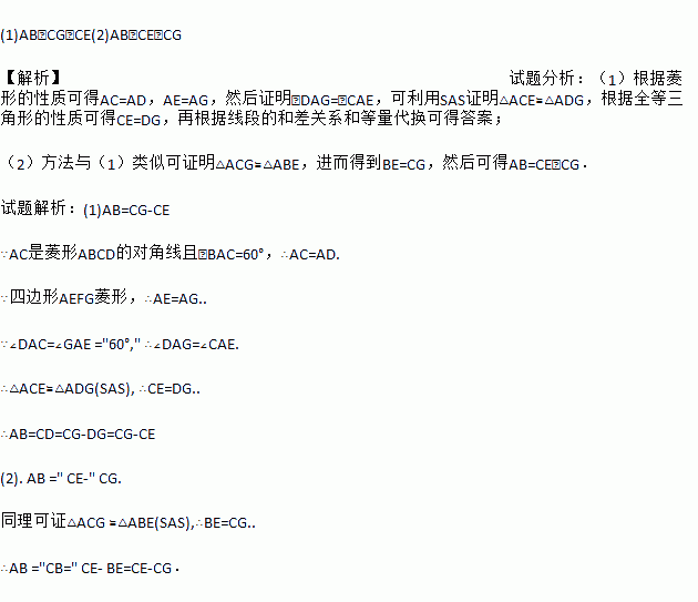 (1)AB=CG-CE(2)AB=CE-CG 【解析】试题分析:(1)根据菱形的性质可得AC=AD,AE=AG,然后证明∠DAG=∠CAE,可利用SAS证明△ACE≌△ADG,根据全等三角形的性质可得CE=DG,再根据线段的和差关系和等量代换可得答案; (2)方法与(1)类似可证明△ACG≌△ABE,进而得到BE=CG,然后可得AB=CE﹣CG. 试题解析:(1)AB=CG-CE...
