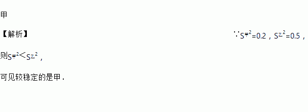 甲、乙两人在相同条件下各射击10次,他们成绩的平均数相同,方差分别是=0.2, =0.5,则设两人中成绩更稳定的是_____(填“甲”或“乙”)