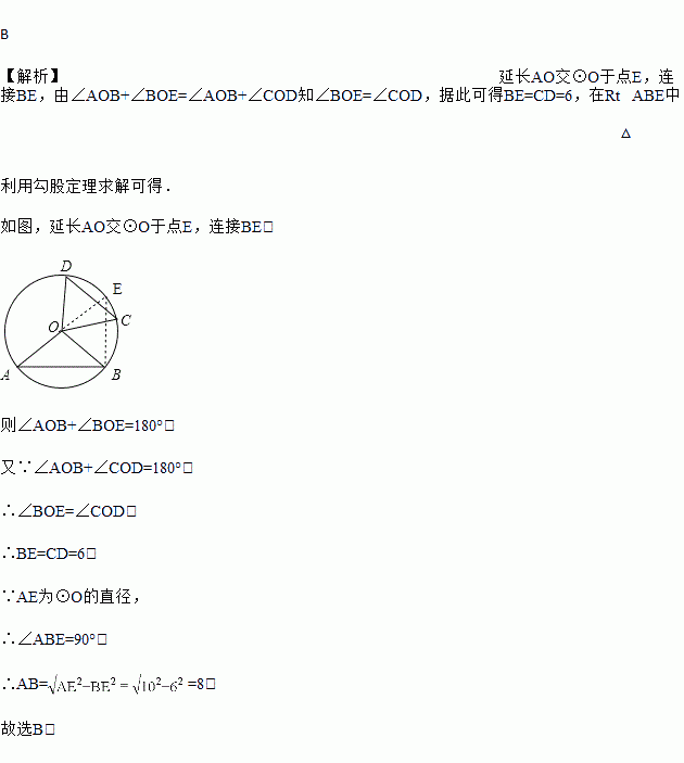 如图,已知⊙O的半径为5,弦AB,CD所对的圆心角分别是∠AOB,COD,若∠AOB与∠COD互补,弦CD=6,则弦AB的长为( )