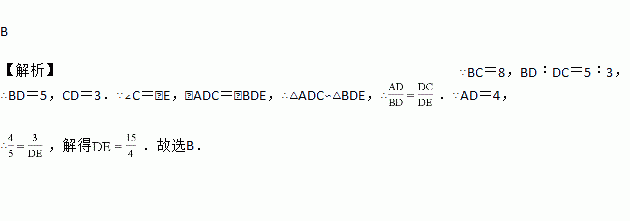 如图,△ABC中,AE交BC于点D,∠C=∠E,AD=4,BC=8,BD:DC=5:3,则DE的长等于( )