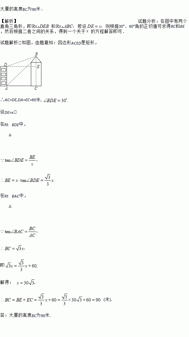 大厦的高度BC为90米. 【解析】试题分析:在图中有两个直角三角形,即和 若设 则根据30°、60°角的正切值可求得BC和BE,然后根据二者之间的关系,得到一个关于的方程解答即可. 试题解析:如图,由题意知:四边形ACED是矩形, ∴AC=DE,DA=EC=60米, 设DE=x, 在Rt△BDE中, 在Rt△BAC中, 即 解得: (米). ...