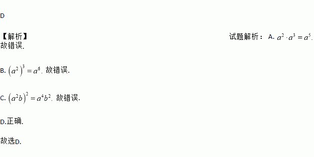 A. a2•a3=a6 B. (a2)3=a5 C. (a2b)2=a2b2 D. a3+a3=2a3