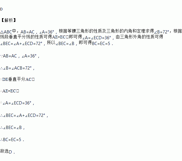 如图,在△ABC中,AB=AC,∠A=36°,AC的垂直平分线交AB于E,D为垂足,连接EC,若CE=5,则BC等于( )