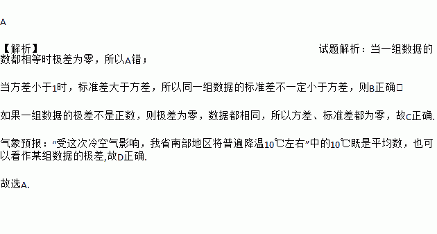 D. 气象预报:“受这次冷空气影响,我省南部地区将普遍降温10°C左右”中的10°C既是平均数,也可以看作某组数据的极差