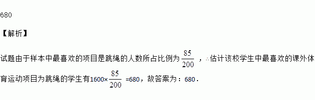 红树林中学共有学生1600人,为了解学生最喜欢的课外体育运动项目的情况,学校随机抽查了200名学生,其中有85名学生表示最喜欢的项目是跳绳,则可估计该校学生中最喜欢的课外体育运动项目为跳绳的学生有_____人.