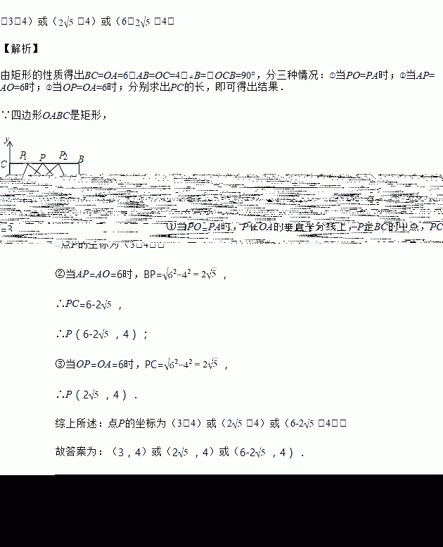 如图,在平面直角坐标系中,矩形OABC的顶点A、C的坐标分别为(6,0)、(0,4),点P是线段BC上的动点,当△OPA是等腰三角形时,则P点的坐标是_____.