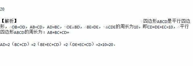 如图,平行四边形ABCD的对角线相交于点O,且AB≠AD,过点O作OE⊥BD交BC于点E,若△CDE的周长为10,则平行四边形ABCD的周长为____.