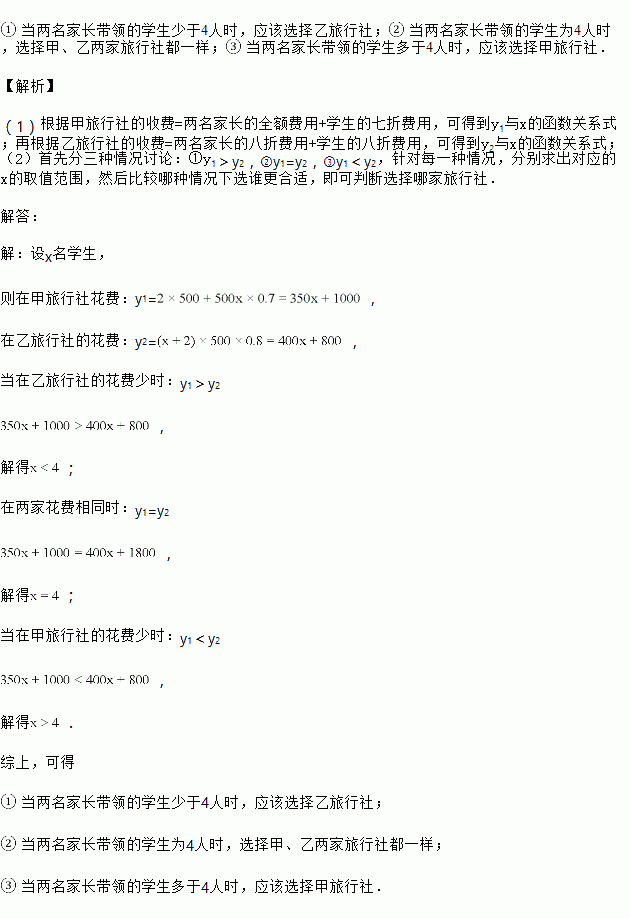 暑假期间,两名教师计划带领若干名学生去旅游,他们联系了报价均为每人500元的两家旅行社经协商,甲旅行社的优惠条件是:两名教师全额收费,学生都按七折收费;乙旅行社的优惠条件是:教师、学生都按八折收费![]()