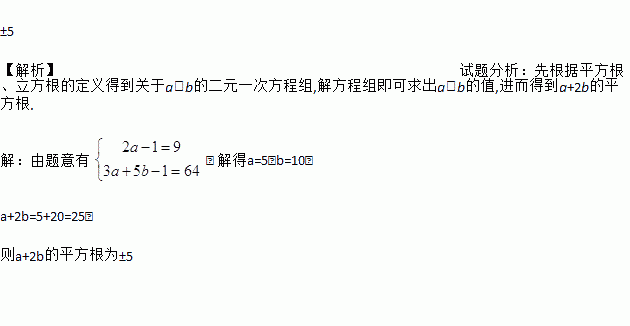 ±5 【解析】试题分析:先根据平方根、立方根的定义得到关于a、b的二元一次方程组,解方程组即可求出a、b的值,进而得到a+2b的平方根. 【解析】 由题意有 , 解得a=5,b=10, a+2b=5+20=25, 则a+2b的平方根为±5