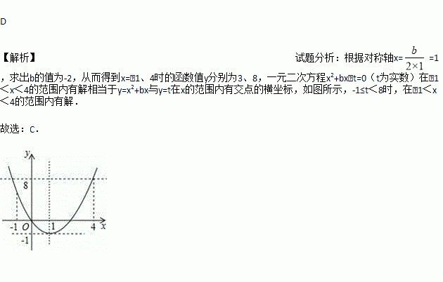 二次函数y=x2+bx的图象如图,对称轴为直线x=1,若关于x的一元二次方程x2+bx﹣t=0(t为实数)在﹣1<x<4的范围内有解,则t的取值范围是()