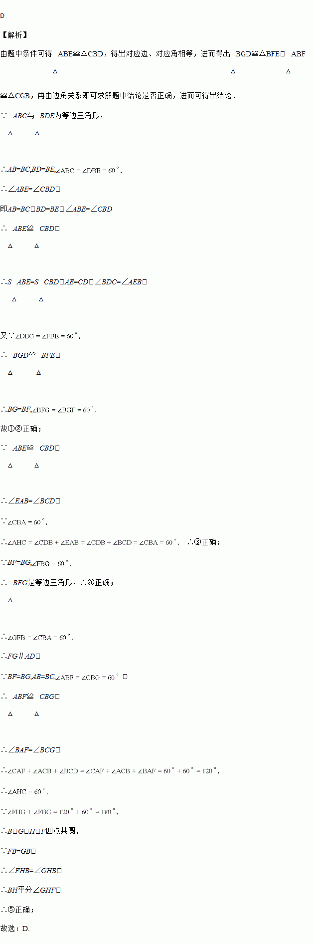 如图所示,已知△ABC和△BDE都是等边三角形.则下列结论:①AE=CD;②BF=BG;③∠AHC=60°;④△BFG是等边三角形;⑤HB平分∠AHD.其中正确的有( )