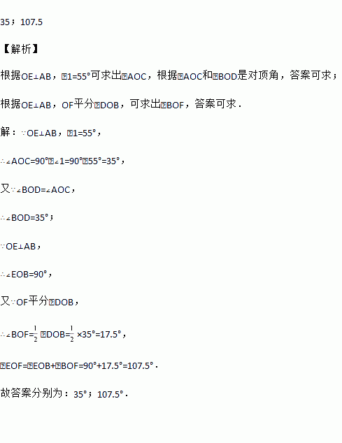 已知直线AB和CD相交于O点,OE⊥AB,∠1=55°,则∠BOD= 度;若OF平分∠DOB,则∠EOF的度数是 度.