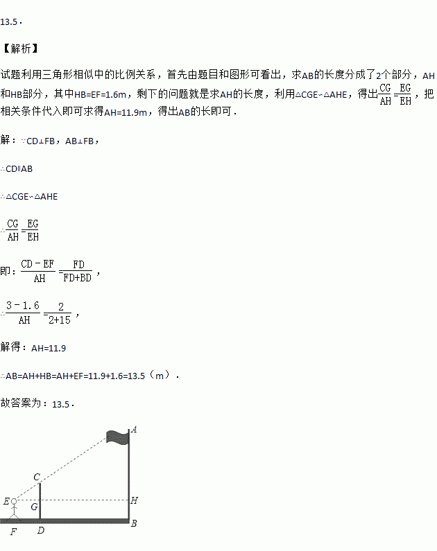 为测量操场上悬挂国旗的旗杆的高度,设计的测量方案如图所示:标杆高度CD=3m,标杆与旗杆的水平距离BD=15 m,人的眼睛与地面的高度EF=1.6m,人与标杆CD的水平距离DF=2m,E、C、A三点共线,则旗杆AB的高度为________ 米.