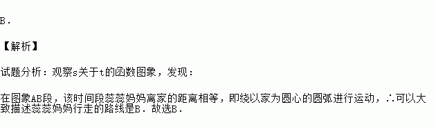 B. 【解析】 试题分析:观察s关于t的函数图象,发现: 在图象AB段,该时间段蕊蕊妈妈离家的距离相等,即绕以家为圆心的圆弧进行运动,∴可以大致描述蕊蕊妈妈行走的路线是B.故选B.