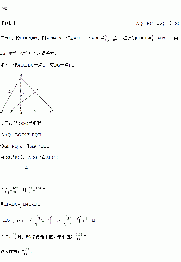 如图,在△ABC中,BC=6,BC边上的高为4,在△ABC的内部作一个矩形EFGH,使EF在BC边上,另外两个顶点分别在AB、AC边上,则对角线EG长的最小值为_____.