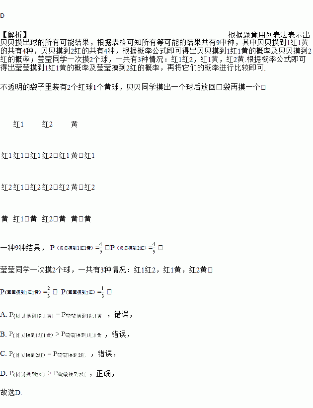 在一个不透明的袋子里装有2个红球1个黄球,这3个小球除颜色不同外,其它都相同,贝贝同学摸出一个球后放回口袋再摸一个;莹莹同学一次摸2个球,两人分别记录下小球的颜色,关于两人摸到1个红球1个黄球和2个红球的概率的描述中,正确的是( )