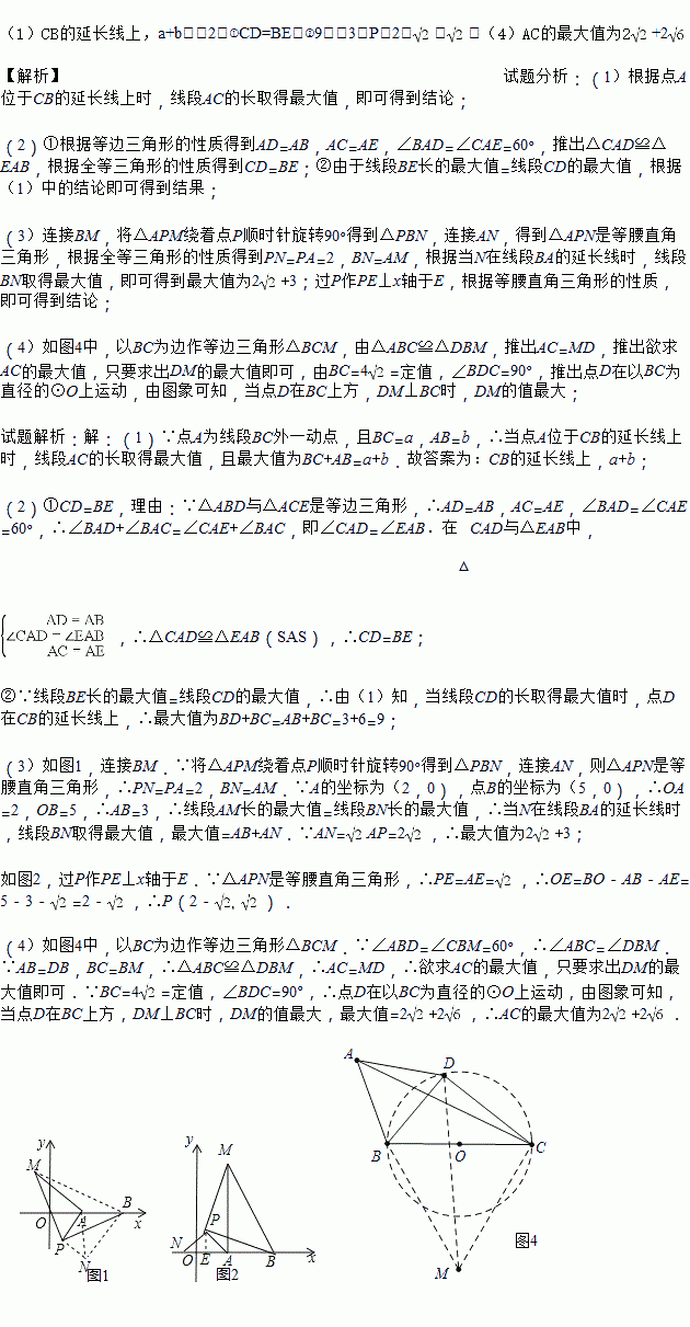 (1)如图1,点A为线段BC外一动点,且BC=a,AB=b,填空:当点A位于 时,线段AC的长取得最大值,且最大值为 (用含a,b的式子表示).